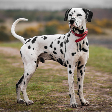 The dignified Dalmatian, dogdom's citizen of the world, is famed for his spotted coat and unique job description. During their long history, these "coach dogs" have accompanied the horse-drawn rigs of nobles, gypsies, and firefighters. The Dalmatian's delightful, eye-catching spots of black or liver adorn one of the most distinctive coats in the animal kingdom. Beneath the spots is a graceful, elegantly proportioned trotting dog standing between 19 and 23 inches at the shoulder. Dals are muscular, built to go the distance; the powerful hindquarters provide the drive behind the smooth, effortless gait. The Dal was originally bred to guard horses and coaches, and some of the old protective instinct remains. Reserved and dignified, Dals can be aloof with strangers and are dependable watchdogs. With their preferred humans, Dals are bright, loyal, and loving house dogs. They are strong, active athletes with great stamina'¿a wonderful partner for runners and hikers.