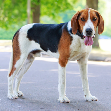 The Harrier is a swift, prey-driven pack hound of medium size first bred in medieval England to chase the hare. Outgoing and friendly, the Harrier is much larger than the Beagle but smaller than another close relative, the English Foxhound.