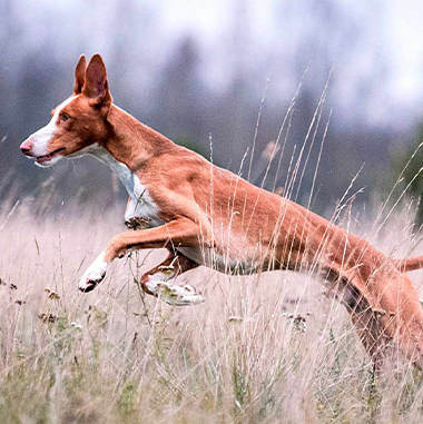 Ibizans are lithe and leggy visitors from the dawn of civilization. Art history students will recognize the elongated head, with its large erect ears, as a familiar motif of ancient Egypt. The elegant, racy body stands 22.5 to 27.5 inches at the shoulder, with coat colors of solid red or white, or red and white patterns. The rosy-colored leathers of the nose, eye rims, and lips, along with amber or caramel eyes, perfectly complement the coat. The breed's quiet grace is often described as deer-like.