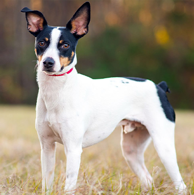 An American original, with a breed name said to be coined by Teddy Roosevelt, the Rat Terrier is a compact, tough, smooth-coated exterminator dog. RTs come in two size varieties and are happy-go-lucky, playful, and portable companions. Balanced, compactly built Rat Terriers are tough but elegant-looking. There are two size divisions: Miniatures stand 10 to 13 inches at the shoulder; standards are over 13 inches and as high as 18 inches. The smooth, shiny coat comes in varieties of pied patterns. (Pied, a word borrowed from the horseman's lexicon, means 'comparatively large patches of one or more colors in combination with white.') These smoothly muscled exterminators are constructed for the efficient movement required for a long day's work.