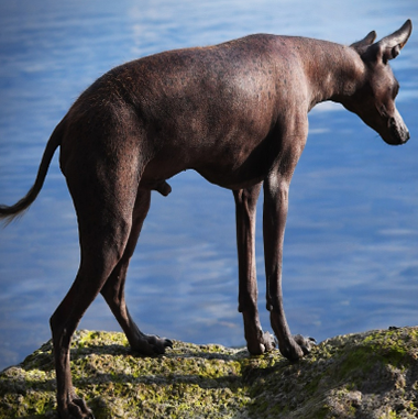 The Xoloitzcuintli comes in three sizes (toy, miniature, and standard), and two varieties (hairless and coated). The hairless has tough, smooth, close-fitting skin. The coated variety is covered by a short, flat coat. Both varieties come in dark colors, ranging from black, gray-black, slate, to red, liver, or bronze. The face is thoughtful and intelligent, and a Xolo's forehead will wrinkle when he's deep in thought. The Xolo's graceful, elegant body is surprisingly strong and rugged.
