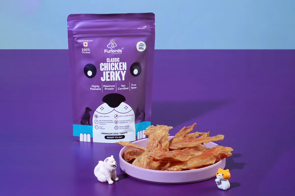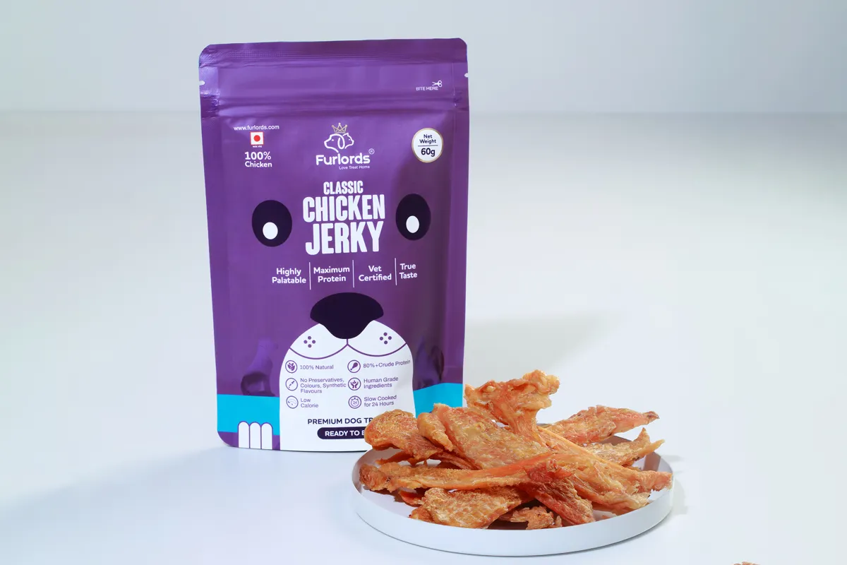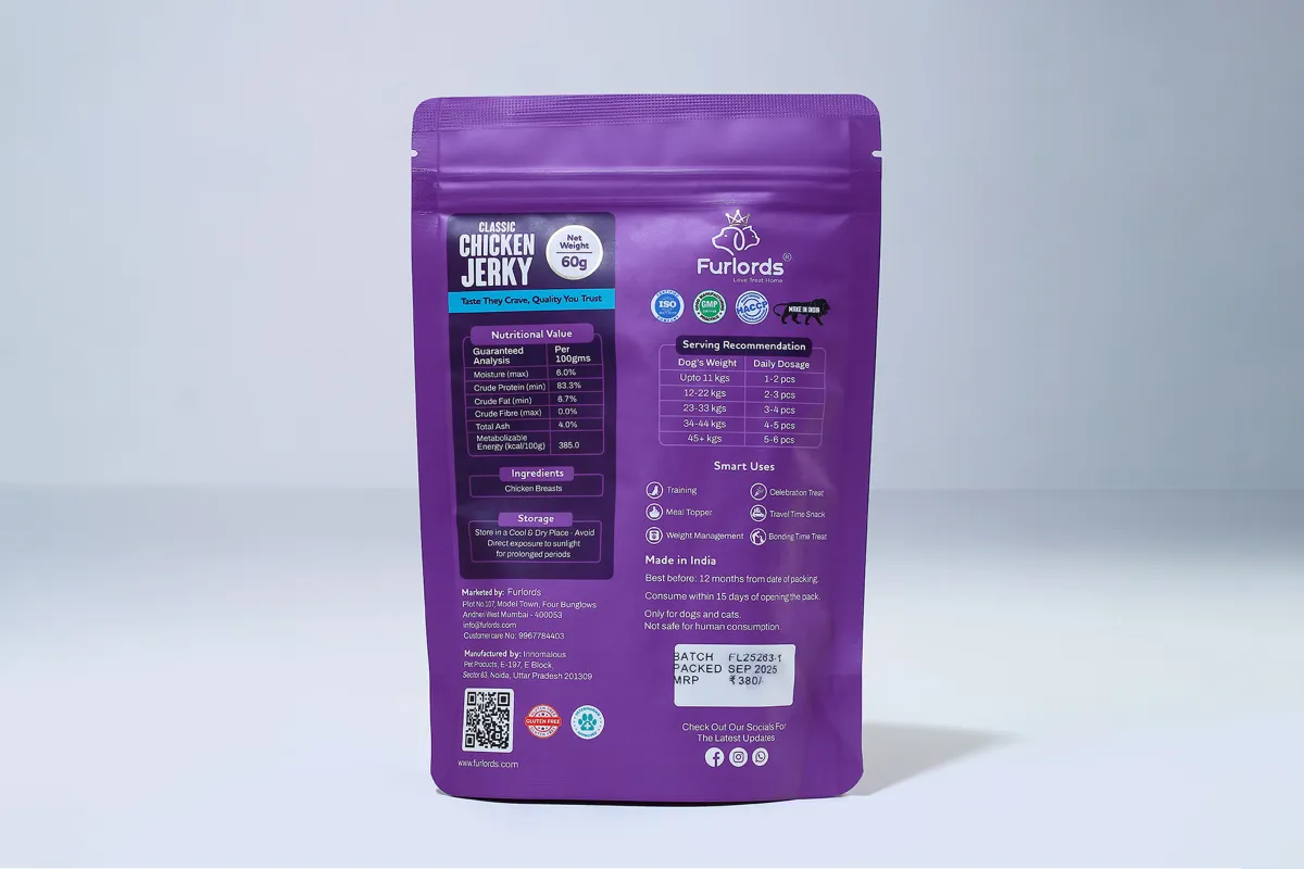 Features & Design Packaged in a vibrant, high-quality purple pouch that ensures freshness, Furlords Classic Chicken Jerky is distinct in its simplicity and quality. The product features authentic, fibrous strips of dried meat, visually confirming its single-ingredient nature—pure chicken breasts. The 60g pack is clearly labeled with essential certifications including ISO, GMP, and HACCP, highlighting a commitment to safety standards. The treats themselves have a golden-brown, natural texture achieved through a meticulous 24-hour slow-cooking process, free from artificial colors, synthetic flavors, or fillers.
