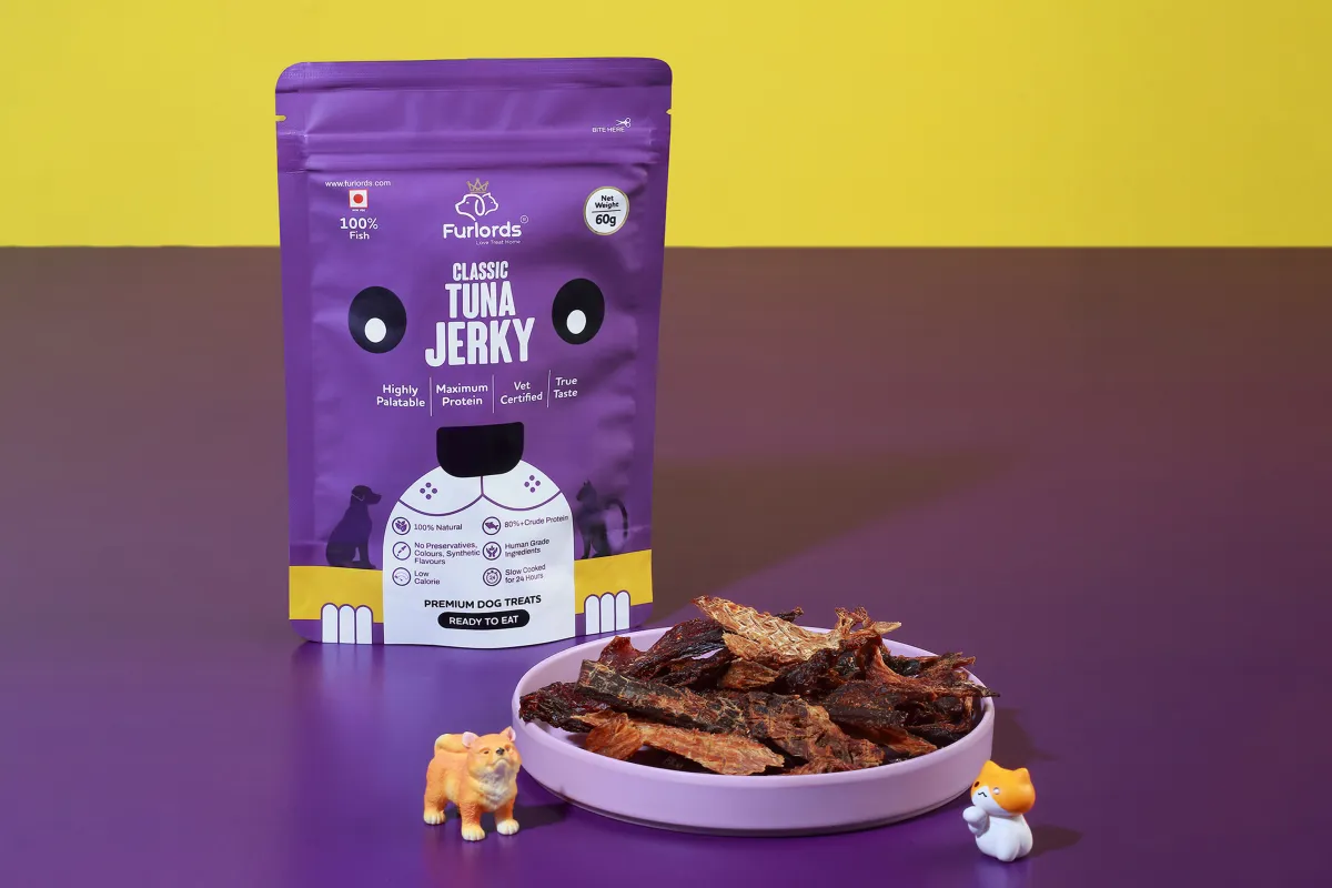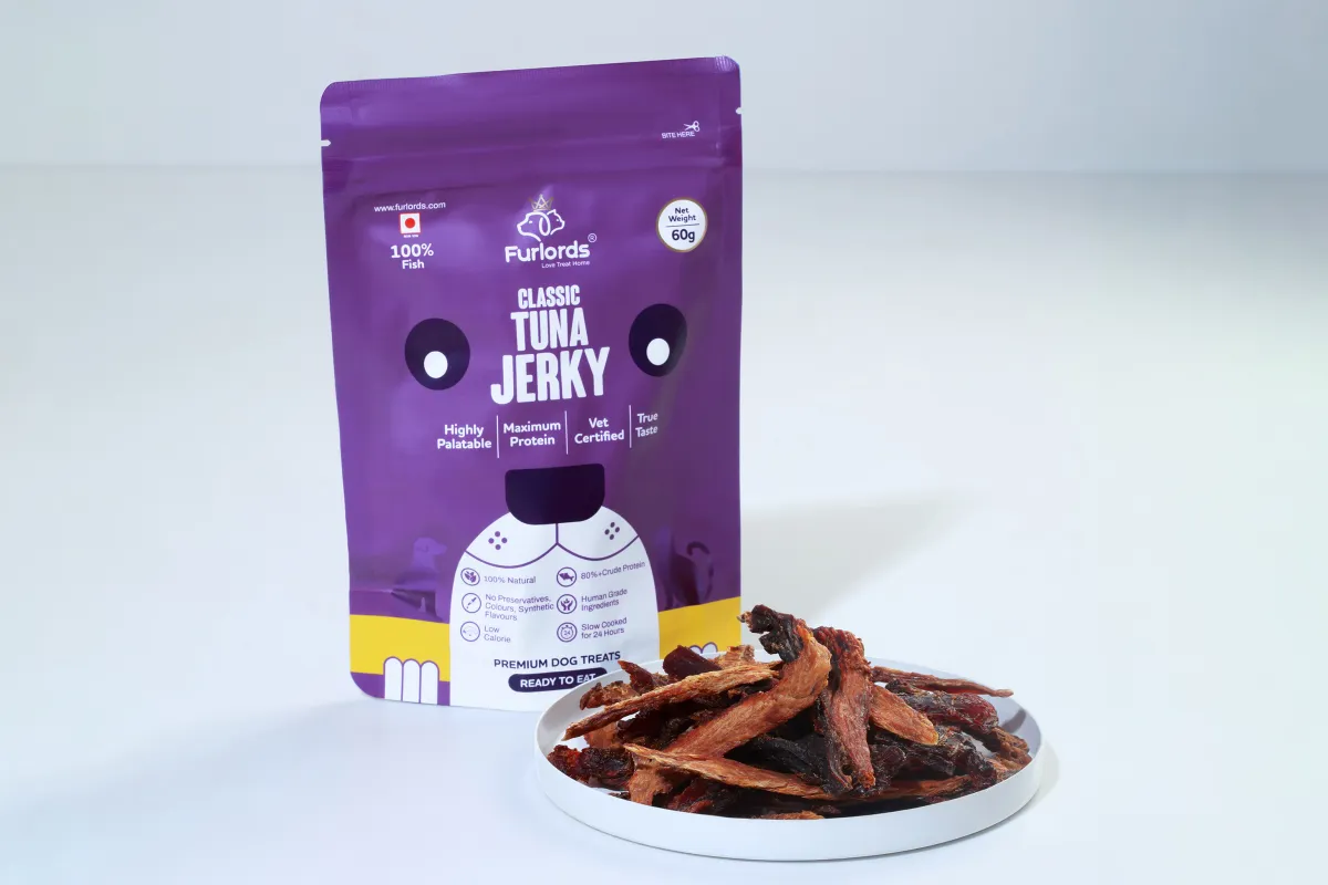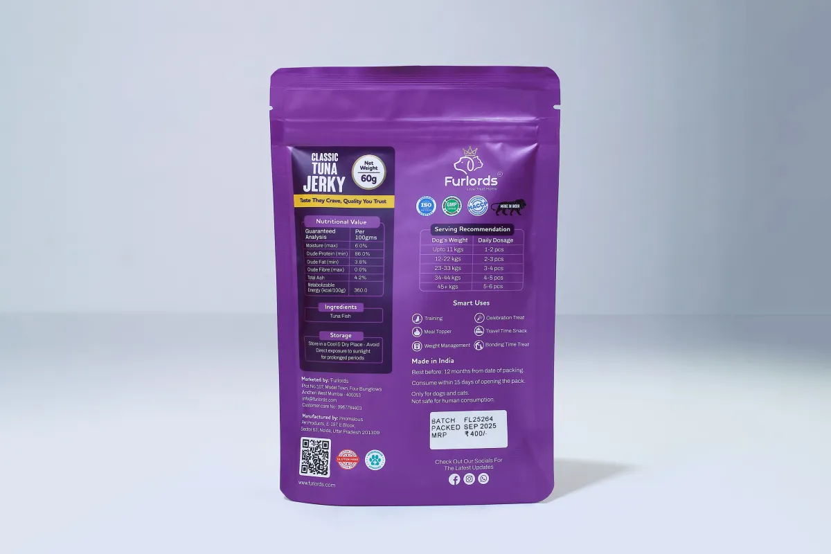 Features & Design: Furlords Classic Tuna Jerky is presented in a premium, resealable purple pouch containing 60g of product, designed to maintain freshness. The treats are made from a single ingredient—Tuna Fish—without the use of any fillers, preservatives, colors, or synthetic flavors. The packaging explicitly displays vital quality assurances, including ISO, GMP, and HACCP certifications, alongside the "Make in India" lion symbol. The nutritional analysis on the back highlights a robust profile with a minimum of 86.0% crude protein and just 3.8% crude fat, ensuring a lean, nutrient-dense snack.