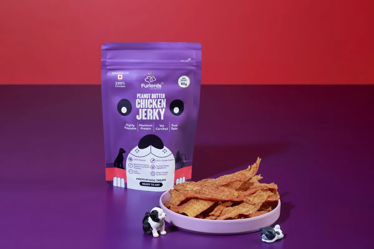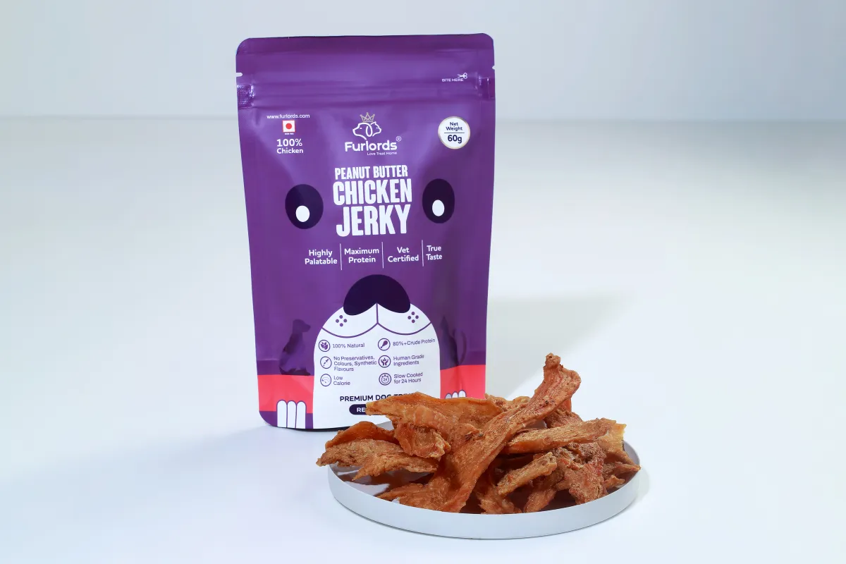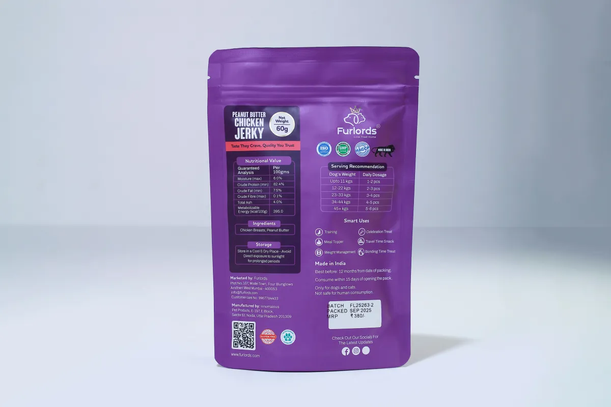 Features & Design: Furlords Peanut Butter Chicken Jerky comes in a high-quality, resealable purple pouch containing 60g of premium treats. The product features a simple, clean label boasting just two ingredients: Chicken Breasts and Peanut Butter. The packaging highlights the product's "Ready to Eat" convenience and displays critical safety certifications, including ISO, GMP, and HACCP, alongside the "Make in India" mark. Visually, the treats are presented as natural dried strips, slow-cooked for 24 hours to achieve the perfect texture without the use of artificial colors or synthetic flavors.